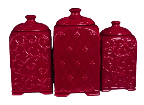 This handsome yet decorative 3 piece large, reversible, handcrafted, ceramic canister set adds functionality and color to any kitchen. Air tight lids with gaskets help preserve stored food. Canister sizes: 6.5 x 12 x 6.5 inch, 5.75 x 11 x 5.75 inch and 5.25 x 10 x 5.25 inch. Our reversible design is 2 sides of each canister have our scroll pattern and the other 2 sides have our fleur de lis and diamond pattern. Handcrafted items may have slight variations.